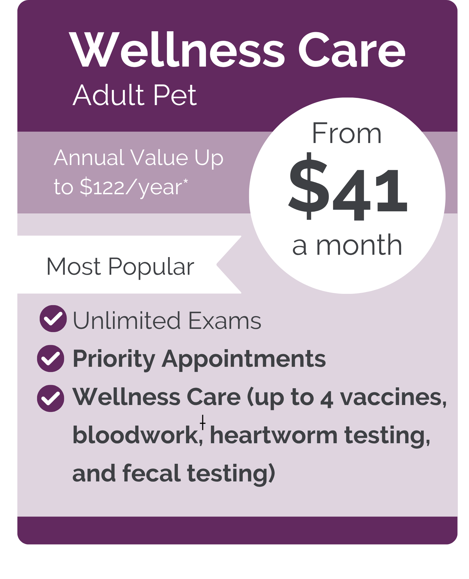 Whether it’s priority appointments and unlimited wellness exams, or you want the full vaccinations and core diagnostics, you’re covered—allowing you to budget for your pet’s care with ease.